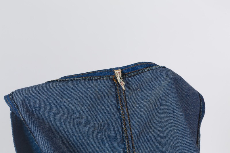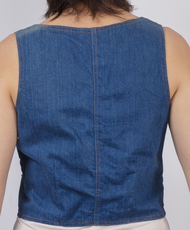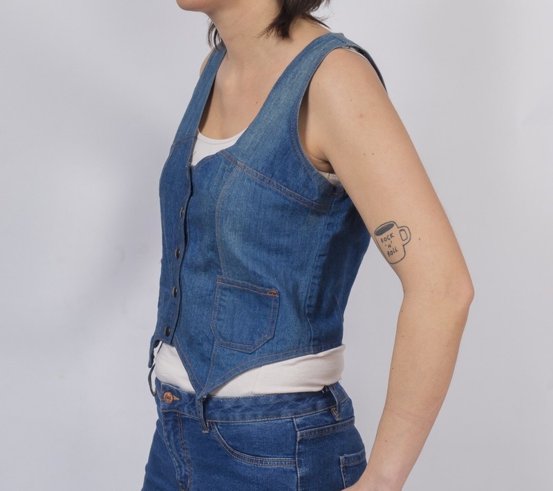 Fastened with 5 metal poppers at the front and has 2 small patch pockets on the front. The denim is a beautiful faded soft colour.