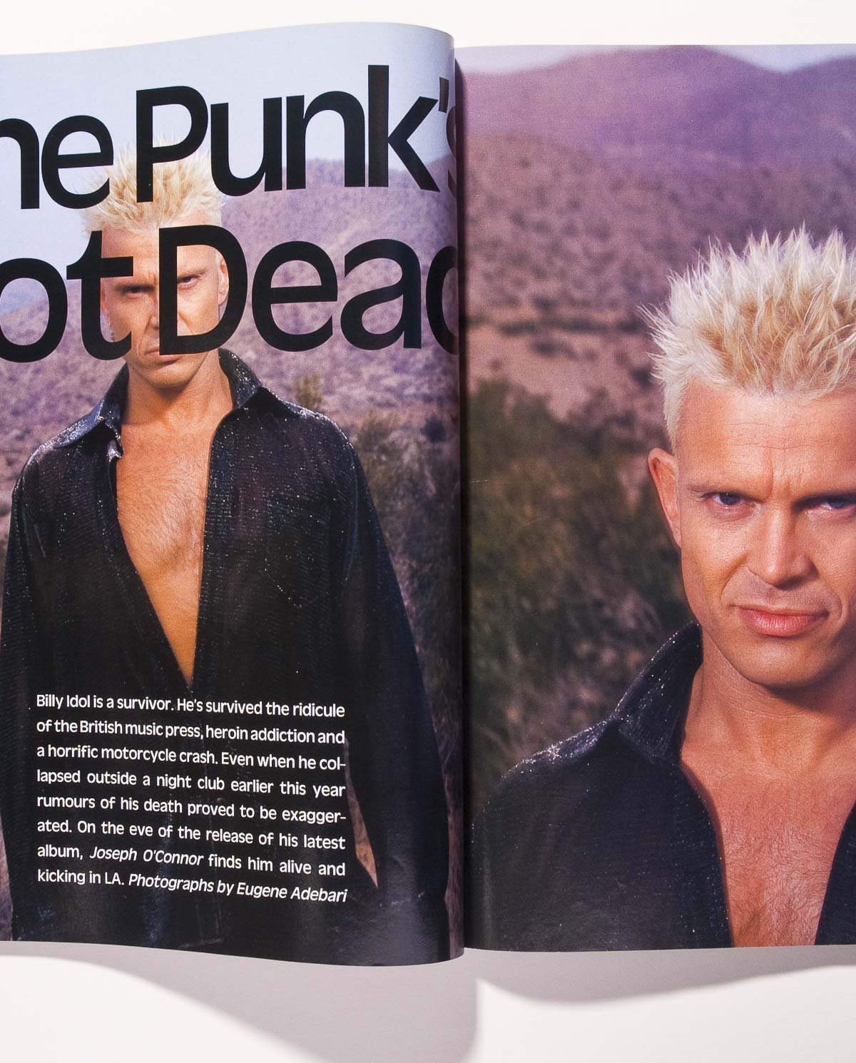 Billy Idol is a survivor. He's survived the the ridicule of the British music press, heroin addiction and a horrific motorcycle crash. Even when he collapsed outside a night club earlier this year rumours of his death proved to be exaggerated. On the eve of the release of his latest album, Esquire find him alive and kicking in LA. 6 page exclusive interview with rare archive photos.