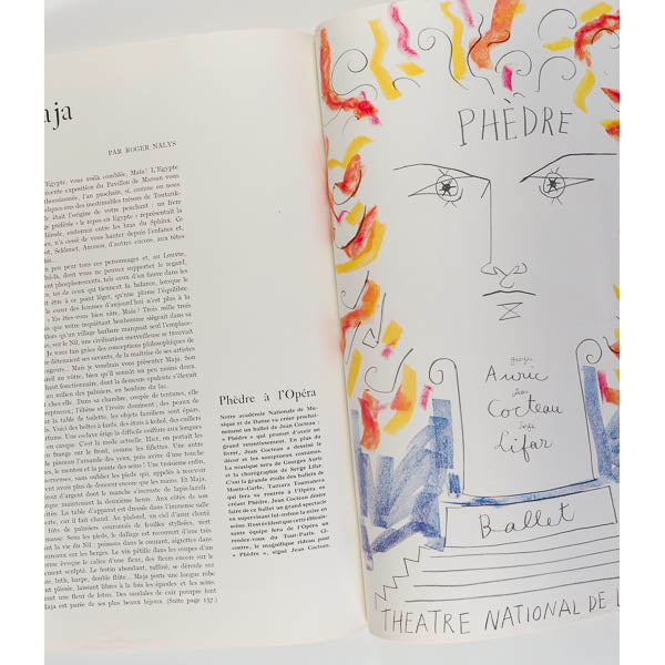 This issue contains additional lavish internal illustrations by Rene Gruau, Pierre Mourgue and Jean Cocteau, as well as editorials featuring designs by Balenciaga, Balmain, Lanvin, Pottier, Paquin, Marcel Rochas, Robert Piguet, Jacques Fath, Jacques Griffe and others. Also contains two page article on French artists and fashion designers in New York.