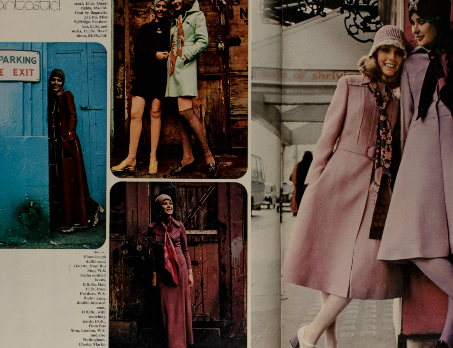 Fashion scoop, spring coats - models wear designs / styles over 4 pages photographed by Peter Mullett, with styling by Sue Hone - BAGATELLE, BELTED coats, BERMONA, BIBA, Bus Stop, Cap, CHESTER MARTIN, CLOCHE HAT, TRENCH COAT, DUFFLE COAT, EDWARD MANN, Elgee, ELLIOTT SHOES, FLARED SKIRT, GABERDINE, GABY, JERSEY, KNEE HIGH BOOTS, MARY JANES, Mary Quant, MAXI COAT, MIDI COAT, MISS SELFRIDGE, PATENT BOOTS, RAVEL, RUSSELL & BROMLEY, SACHA, SCARF, TROUSER AND COAT SET, SHOES, over the knee socks, TIGHTS, TROUSERS and Wallis.