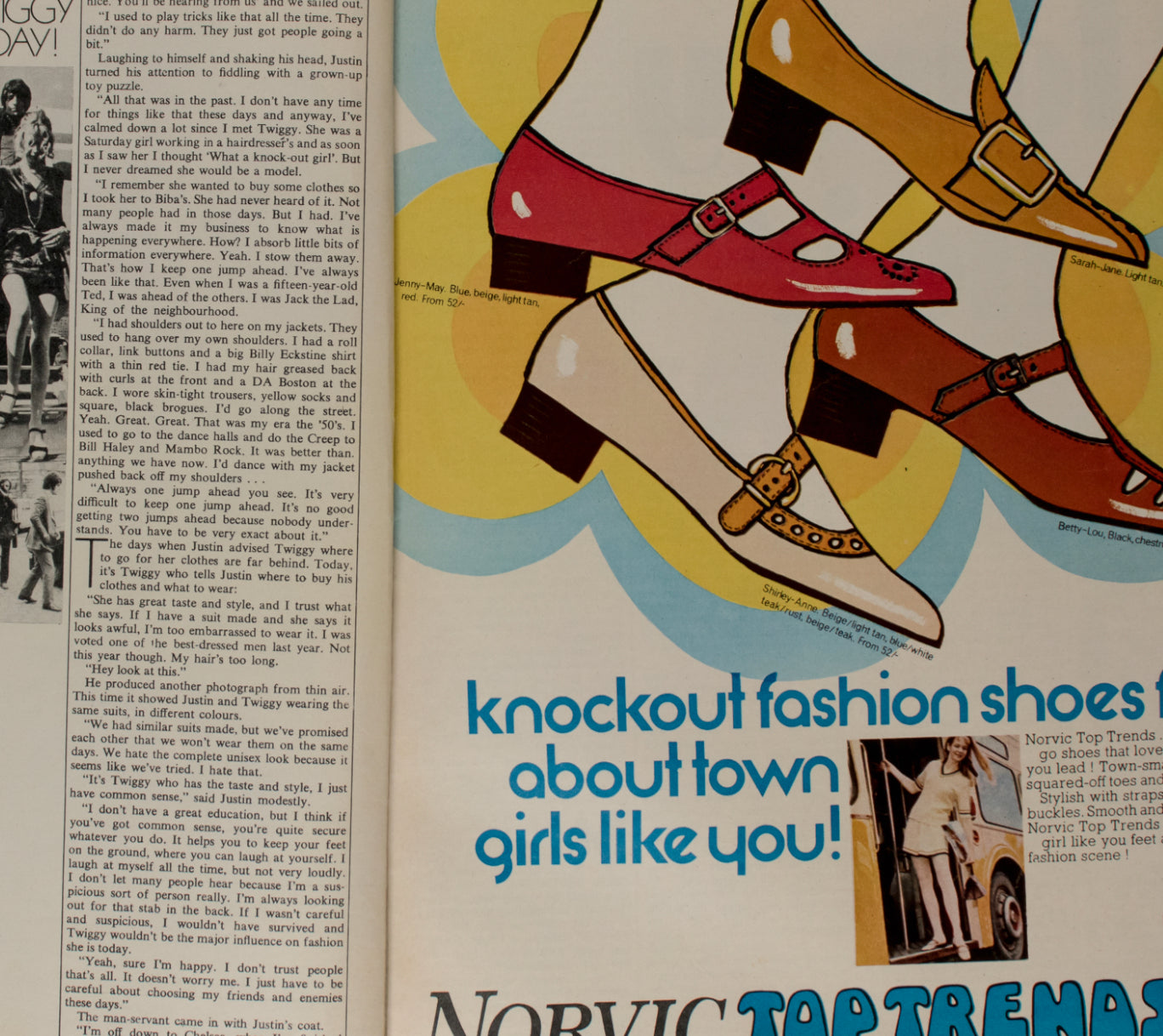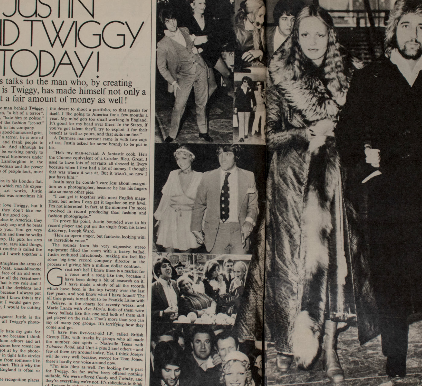 Justin de Villeneuve - the man behind Twiggy. 3 page interview, many photos of the model and her manager boyfriend.