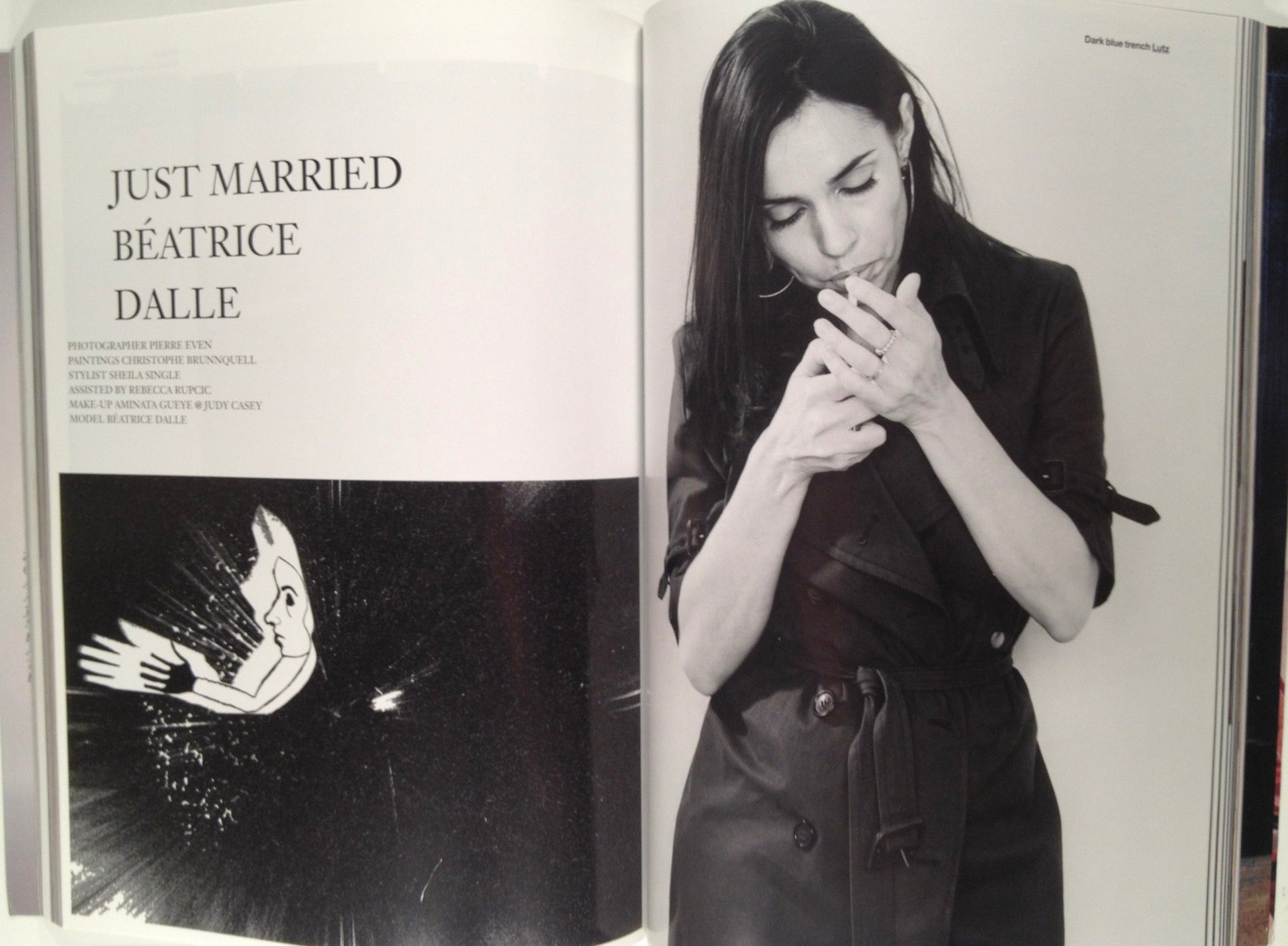 Beatrice Dalle wears a trenchcoat by LUTZ, is photographed by PIERRE EVEN, and with paintings by CHRISTOPHE BRUNNQUELL in 'Just Married'.