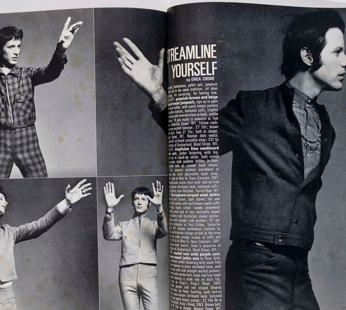 Bill King photographs a menswear fashion spread titled 'Streamline Yourself'. Mod suits etc by Tom Gilbey, Way In at Harrods, Peter Golding etc.