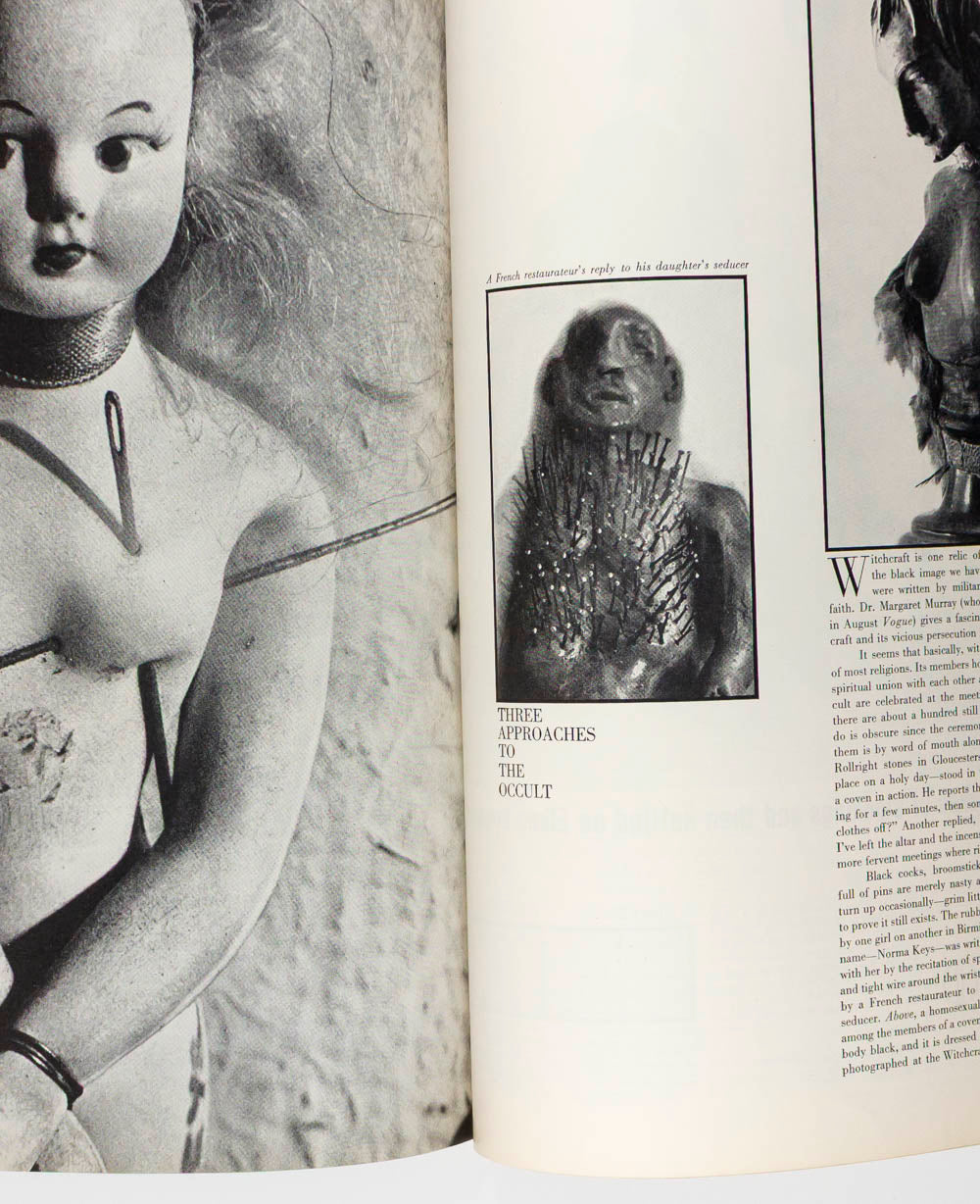 'Three Approaches to the Occult' written and photographed by Peter Laurie. Witchcraft, dolls and witches, 4 pages. Images include -
